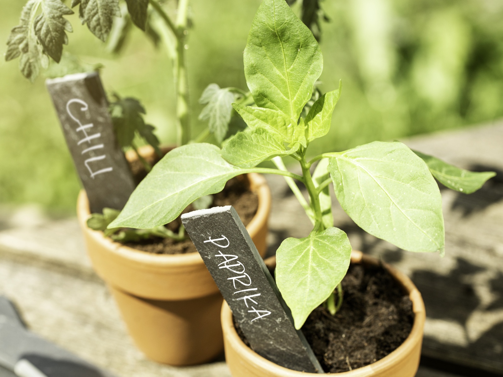 Nun geht es schon fast ans Aussäen. Notiere mit einer Kreide Pflanzen- und Sortennamen auf den Beschriftungskärtchen, um später Verwechslungen zu vermeiden.