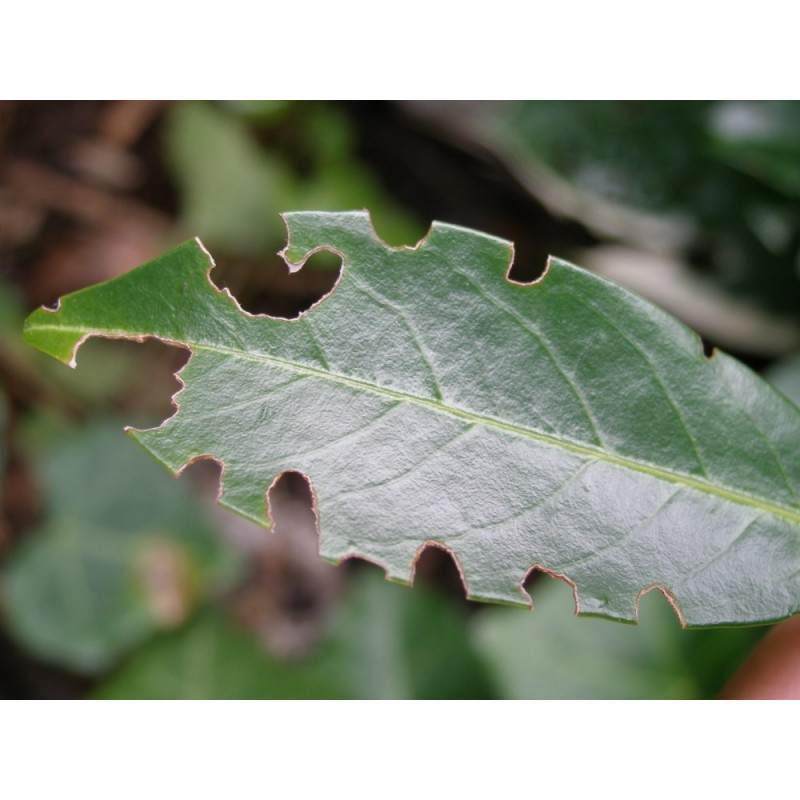 Schadbild: der Käfer frisst buchtige Kerben in Blätter von Kirschlorbeer, Hortensien, Liguster und anderen Stauden und Gehölzen.