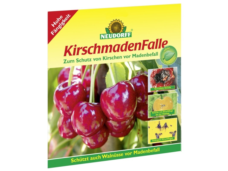 Große Gelbtafeln im Kirschbaum werden von der Kirschfruchtfliege mit reifenden Kirschen verwechselt. Sie bleiben an den Tafeln kleben. Entferne die Gelbtafeln nach der Flugzeit, um andere Insekten zu schonen.