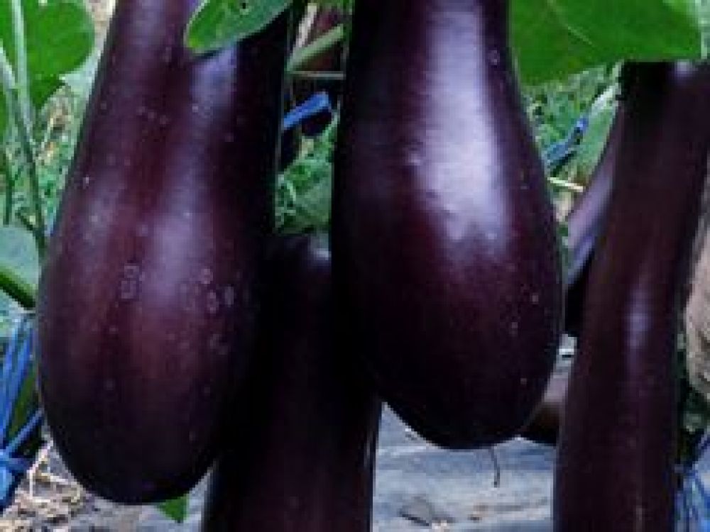 Bildet schlanke, dunkelviolette Früchte mit grünem Kelch. Kräftige und ertragreiche Pflanzen. Geeignet für Gewächshausanbau und warme Lagen im Freiland.