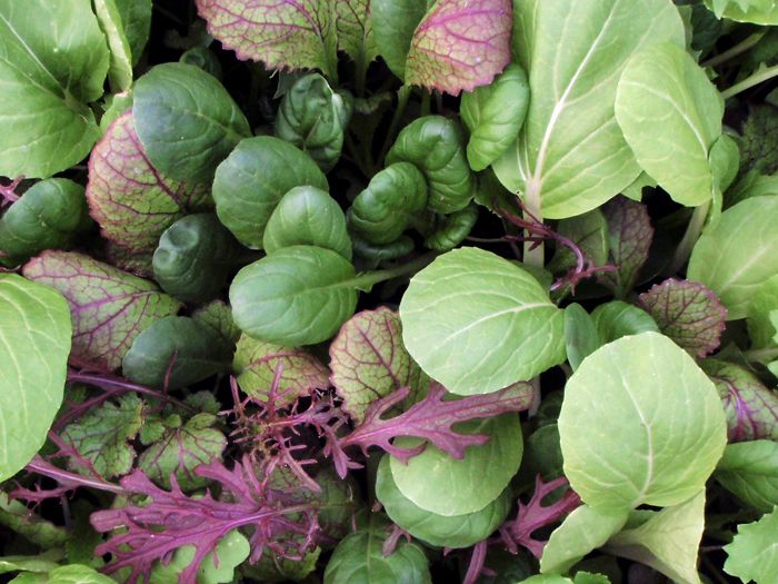 In dieser Asia-Salat Mischung sind verschiedene Sorten kombiniert – unter anderem Mizuna, Pak Choi, Red Giant usw.