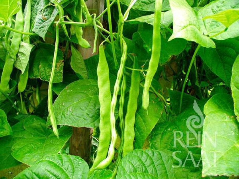 Mittelfrühe grüne Schwertbohne mit flachen, ca. 25 cm langen und 2 cm breiten Hülsen. Diese sind fleischig und fadenlos. Die Pflanzen sind sehr wüchsig und ertragreich. Ideal als Schnittbohnen für Salate, Gemüsebeilage und Eintöpfe.