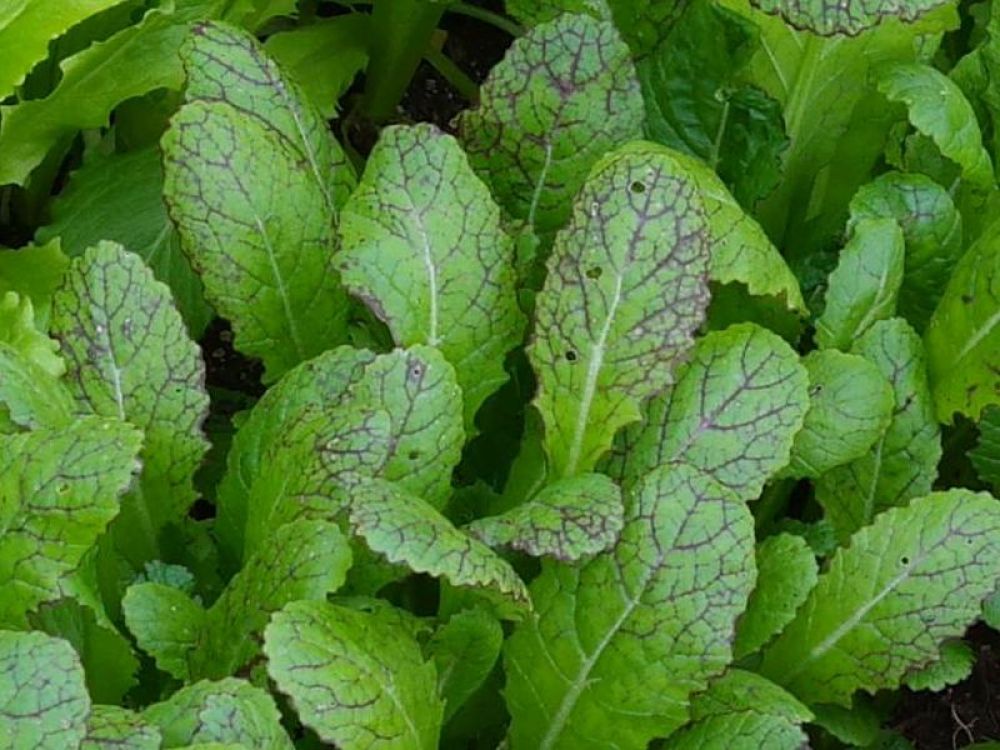 Salatkraut mit breiten, grün-roten, leicht gezackten Blättern und roten, ins Blatt überlaufenden Blattadern. Für Frühjahrs- und Herbstaussaat. Sehr kältetolerant.